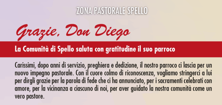 ZONA PASTORALE SPELLO Grazie, Don DiegoLa Comunità di Spello saluta con gratitudine il suo parrocoSabato 18 ottobre ore 17.30 chiesa di santa Maria Maggiorecelebrazione eucaristica presieduta dal VescovoSegue momento conviviale Bentornato, Don GiuseppeLa Comunità di Spello accoglie con gioia il nuovo parroco, don GiuseppeDomenica 19 ottobre ore 17.30 chiesa di...