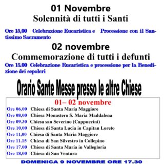 Programma delle Celebrazioni 27 ottobre – 08 novembre Dal lunedì al sabato, Chiesa di San Ventura Ore 17:00 Preghiera del RosarioOre 17:30 Celebrazione e Adorazione...